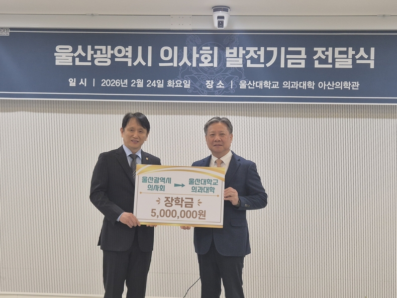 울산광역시의사회(회장 김양국)는 2월 24일 울산대학교 의과대학 지역사회기반 의학교육 추진위원회 출범식에서 울산대학교 의과대학 학생을 위한 장학금 500만원을 임영석 울산의대학장에게 전달했다.