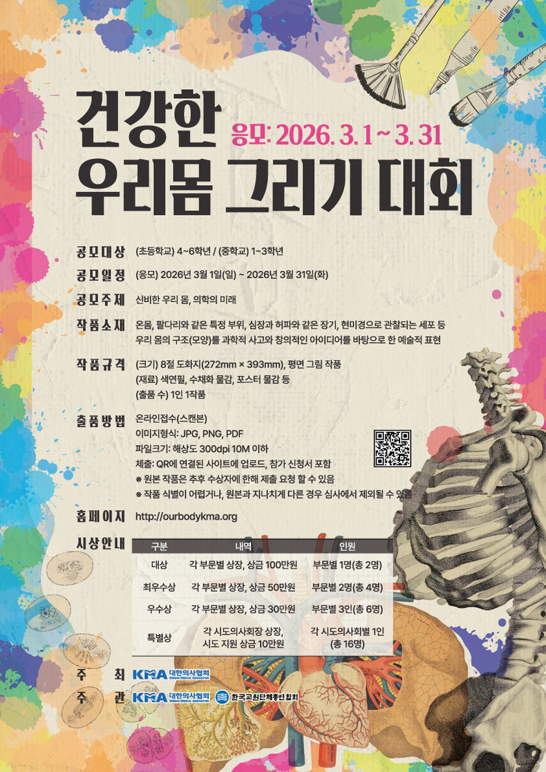 대한의사협회는 다가오는 7월 열리는 제43차 대한의사협회 종합학술대회의 주요 국민 참여 프로그램의 일환으로 전국 초·중학생 대상 ‘건강한 우리몸 그리기 대회’를 개최한다.