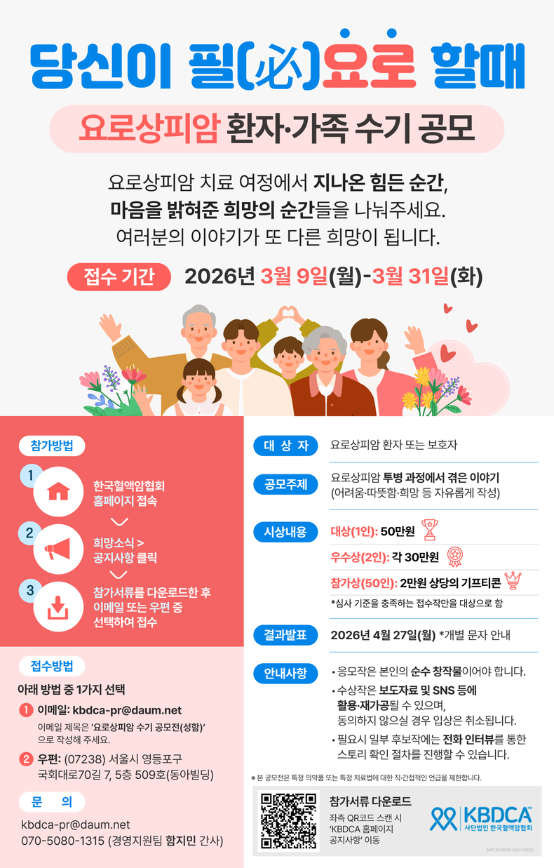 한국혈액암협회 박정숙 사무총장은 “암 환자와 가족들의 경험담은 같은 질환을 마주한 또 다른 환자와 보호자들에게 큰 위로와 힘이 될 수 있다”며, “특히 전이성 요로상피암처럼 치료 과정이 쉽지 않은 질환의 경우, 환자와 가족들이 겪는 어려움이 큰 만큼 이번 공모전을 통해 전해질 진솔한 이야기가 더 많은 공감과 관심으로 이어지길 바란다”고 전했다.