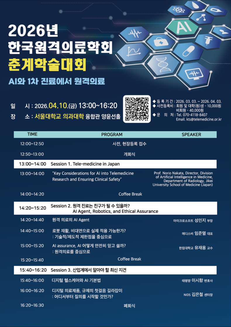 한국원격의료학회 (회장 강대희, 이사장 유경호)는 지난 10일 오후 1시부터 4시 20분까지 서울대학교 의과대학 융합관 양윤선홀에서 “2026년 한국원격의료학회 춘계학술대회“를 개최했다고 밝혔다. 이번 학술대회는 ”AI와 1차 진료에서의 원격의료“를 주제로, 인공지능(AI) 기술의 발전과 함께 변화하는 원격 의료의 현재와 미래를 조망하고, 임상 적용 및 정책·윤리적 이슈를 폭넓게 논의하는 자리로 마련된다.