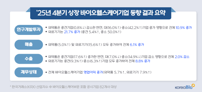 한국바이오협회는 ‘2025년 4분기 및 연간 상장 바이오헬스케어기업 동향조사’ 결과를 27일 발표했다. 이번 조사는 한국거래소(KRX) 산업지수 中 바이오헬스케어 부문에 포함된 82개 공시기업 대상 ‘25년 12월 사업보고서를 기반으로 수행했으며, 분야별(의약품·의료기기) 및 기업규모별(대·중견·중소)로 구분해 ▲인력 ▲연구개발비 ▲매출 ▲재무상태 등을 종합 분석했다.