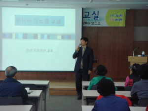 근로복지공단 안산산재병원은 12일 상록수보건소에서 노인 50여명을 대상으로 ‘당뇨’에 관한 건강강좌를 실시했다. 강좌에서는 당뇨병의 원인, 예방법, 치료방법 등이 알기 쉽게 설명돼 큰 호응을 받았다.