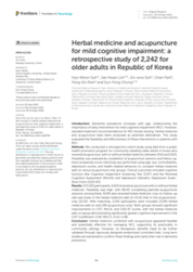 서울특별시와 서울특별시한의사회가 공동으로 시행한 ‘한의약 치매 건강증진사업’(Korean Medicine Senior Health Promotion Program, KSHPP) 의 2021~2023년 3개년 데이터 결과를 바탕으로 한 연구 ‘Herbal medicine and acupuncture for mild cognitive impairment: a retrospective study of 2242 older adults in the Republic of Korea’가 2025년 10월 29일 국제학술지 Frontiers in Neurology에 게재됐다. 이번 연구에는 서울특별시한의사회 서효원 의무이사, 임재환 부회장이 제1저자로 참여했으며, 총 5525명의 대상자를 분석한 대규모 후향적 코호트 연구로 한의약 기반 치매 예방 프로그램의 실효성과 공공보건적 가치를 과학적으로 검증했다. 또한, 2천명 이상의 환자 데이터를 분석한 연구로서, 한의계 연구로서는 규모가 매우 크고 시 단위의 자료로서 원자료 자체의 대표성도 상당히 높다. 이번 연구는 한의원과 보건소를 통해 프로그램에 참여한 60세 이상 경도인지장애(Mild Cognitive Impairment,