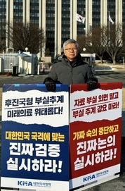 의대정원 확대 정책에 반대하는 1인시위가 한 달째 이어지고 있는 가운데, 대한의사협회 김택우 회장도 직접 서울 정부청사 앞에서 반대 목소리를 냈다. ‘범의료계 국민건강보호 대책특별위원회(범대위)’ 산하 투쟁위원회 주도로 진행하는 릴레이 1인 시위는 8일 좌훈정 투쟁위원장(의협 부회장)부터 투쟁위원들이 한파를 뚫고 한 달째 이어가고 있다. 범대위 위원장이기도 한 김택우 회장은 27일 서울 정부청사 앞에서 직접 의사인력 추계가 부실하다는 내용의 피켓을 들었다. 김 회장은 “현재 약 6000명의 24, 25학번 학생이 함께 공부하고 있다. 지난 정부의 2000명 증원 여파가 앞으로 얼마나 오랜 시간의 몸살을 겪어야 할지 가늠할 수도 없는 게 현실”이라며 “그럼에도 몸살에 대한 대책 등 논의가 전혀 없다”고 지적했다. 그러면서 “교육 당사자인 학생과 교수의 어려움은 전혀 고려되고 있지 않은 상태로 단순히 의대정원 숫자만 언급하고 있는 현실이 참담하다”라며 “이 비정상적인 상황이 끝나기 전까지 추가 정원은 물리적으로 불가능하다. 숫자놀이에 매몰돼 교육의 질을 포기하는 것은 의료의 미래를 포기하는 것과 같다”고 호소했다. 또 “정부는 현재 강조하고 있는 지역의료와 필수