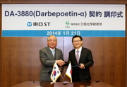 동아에스티(대표이사 사장 박찬일)는 21일 오후 본사에서 박찬일사장, 일본 산와화학연구소(SKK)의 야마모토 카즈오 사장 등이 참석한 가운데 SKK와 자사가 개발 중인 바이오시밀러 ‘DA-3880’의 라이센싱 아웃 계약을 체결했다고 22일 밝혔다. 이번 계약으로 SKK는 일본에서 바이오 벤처 회사인 GTS(Gene Techno Science)社와 ‘DA-3880’을 공동개발 하고 완료 후 판매를 전적으로 담당하게 되며, 동아에스티는 본 계약에 따라 SKK의 ‘DA-3880’ 일본 내 개발을 돕고 계약금과 더불어 개발 진행 단계에 따른 마일스톤을 받게 될 예정이다. 또한 일본 내 개발 완료 후 제품을 생산해 SKK에 공급함으로써 완제 수출에 따른 추가 이익이 기대된다. SKK는 일본 스즈켄그룹(Suzuken, 2012년 매출 1조 8945억엔)의 100% 자회사로 당뇨병치료제 등을 주력으로 하는 연 매출 685억엔(6,850억 원)의 중견제약사다. ‘DA-3880’은 지속형 적혈구 조혈자극제 ‘Darbepoetin-α(다베포이틴-알파)’의 바이오시밀러 제품이며 만성신부전환자의 빈혈 및 화학요법에 의한 빈혈치료에 사용된다. 동아에스티는 ‘DA-3880’의 201