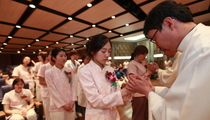 가톨릭대학교 대전성모병원 간호부(부장 송미경)는 12일 오후 3시 병원 9층 상지홀에서 간호사 91명을 대상으로 ‘손 축복식’을 실시했다.‘손 축복식’은 ‘마음간호’를 실천하는 간호사들의 손을 통해 환자의 육체적 질병과 마음의 고통까지 덜어주는 최선의 간호를 할 있도록 축복하는 행사다. 가톨릭대학교 대전성모병원 이원화 원목실장 신부는 “치유자는 하느님이심을 깨닫고 주님의 사랑을 전하는 축복받은 간호사로서 기쁨과 자긍심을 갖길 바란다”고 말하며 “오늘 축복받은 손으로 환자들의 아픈 몸과 마음을 어루만져주며, 환자들에게 따뜻한 사랑을 나눠주길 바란다”고 말했다. ※사진설명 : 가톨릭대학교 대전성모병원 이원화 원목실장 신부의 집전으로 간호사들에게 손 축복식을 하고 있다.