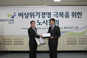 보령제약(대표 김광호) 임직원과 노동조합원들이 위기극복을 위한 노사화합을 다짐했다. 4일 경기도 안산시에 위치한 생산공장에서 김광호 사장과 장병섭 노조위원장 등 임직원과 노동조합원들이 참석한 가운데 열린 ‘위기 극복을 위한 노사결의 대회’에서 글로벌 경기침체 및 약가인하 등 어려운 경영환경을 극복하고 영업목표 달성을 이루기 위한 각오를 다졌다.김광호 사장과 장병섭 노조위원장은 영업목표 100%달성과 위기극복을 위한 3가지 사항을 공동으로 결의, 발표했다.발표문은 “우리는 품질혁신 시스템을 정착하고 사람경쟁력을 강화해 인당생산성 향상에 최선을 다한다”, “우리는 GMP를 준수하고 클레임 없는 일등제품을 생산해 매출목표 100%달성에 최선을 다한다”, “우리는 BPI(Boryung Production Innovation:생산성 향상 운동)활동을 통한 생산성 향상으로 경쟁력 있는 제품을 생산해 이익목표 100% 달성에 최선을 다한다”이다.김광호 사장은 “올해 세계경기 침체와 약가인하로 인한 경영환경이 매우 어려울 것으로 예상되지만, 노사가 먼저 합심하고, 서로의 자리에서 자신의 역할에 최선을 다한다면 충분히 극복할 수 있을 것”이며 “결의문처럼 노사가 하나 돼 온