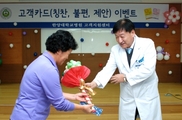 상세검색양대학교병원 고객지원센터에서는 최근 고객들의 불만사항이나 개선사항에 대해 병원 경영에 적극적으로 반영하기 위해 최근 본관 3층 강당에서 ‘고객카드 이벤트’를 진행했다. 이 이벤트는 현재 한양대병원에 입원 중인 환자 및 보호자들이 다양한 의견을 ‘고객카드’로 제안해 준데 대한 감사의 표시로 시상 및 경품을 제공한 행사이다.고객지원센터(과장 이영애)에서는 앞으로도 지속적으로 고객 만족도 향상과 고객들의 만족, 불편, 제안 등을 할 수 있는 ‘고객카드’ 제도를 꾸준히 진행하기로 했다.남정현 병원장은 인사말에서 “고객의 단소리, 쓴소리, 좋은 제안 등 모두 겸허히 받아들이고 개선해야 할 부분은 최선을 다해 고치도록 노력하겠다”고 밝혔다.또한 “앞으로도 계속 병원에 대한 많은 의견들을 보내주시면 적극적으로 개선하기 위한 제도를 마련하겠다”고 말했다.